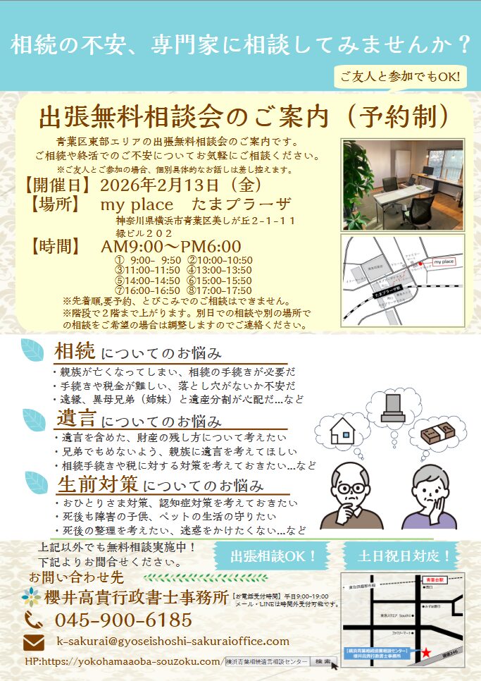 弊所では毎月無料相談会(1月分は2月へ調整)や、相続に関するセミナーを開催しております。相談会以外でも無料相談は承っておりますが、まずは気になっている点を確認したい、いきなり個別相談は不安だ…など、感じられる方は相談会の活用もご検討ください。セミナーを開催する際は、こちらにてお知らせいたします。
